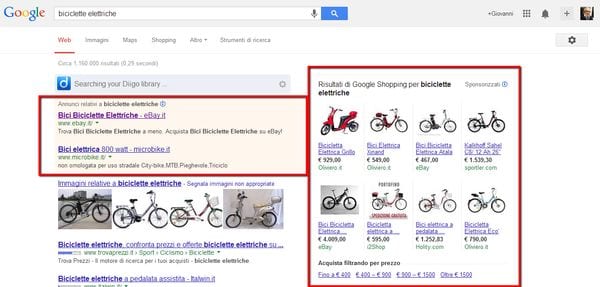 Per chi non fosse ancora convinto, questa immagine mostra la ricerca per “biciclette elettriche”, con i risultati che sono ottimizzati per gli inserzionisti. Magari “biciclette elettriche” non è nel tuo interesse odierno, ma un po’ alla volta questa sarà la situazione per tutti i principali prodotti, con i risultati secchi occupati magari da grandi rivenditori e poche persone andranno “above the fold”.