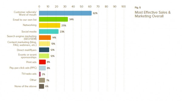 Quasi il 62% delle piccole imprese intervistate indica il passa parola come la strategia più efficace, seguita da dall’email marketing per il 34%, il networking per il 25% , i social media al 23%, le attività SEM per il 14% ed il content marketing per il 13%.
