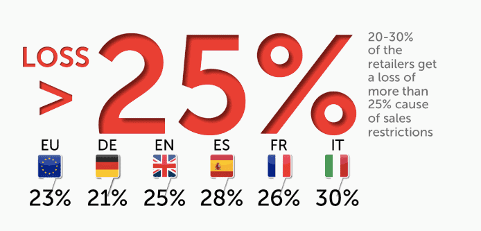 Secondo l’indagine di BVOH si lamentano oltre il 50 per cento dei commercianti che dichiarano di aver ha perso entrate da restrizioni delle vendite. Quasi un quinto dei commercianti europei lamenta una perdita annuale del 25 per cento o più.