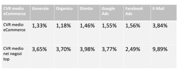 I tassi medi sono la composizione delle percentuali che derivano dalle fonti di traffico, che hanno pesi diversi nei diversi shop online. È interessante vedere come il tasso di conversione di Google Ads sia più alto nei negozi top, anche in funzione del maggior investimento possibile. Ma è anche interessante vedere come il tasso di conversione delle eMail sia il miglior tasso di conversione.