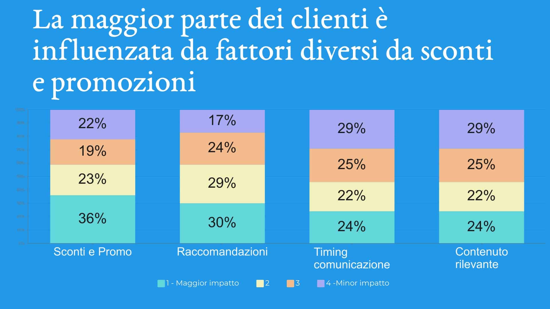 Ciò significa che la maggior parte dei marchi che si affidano agli sconti per acquisire clienti stanno regalando inutilmente margini al 64% degli acquirenti che sono maggiormente influenzati da altri fattori. Ad esempio raccomandazioni pertinenti sui prodotti (30%), tempistiche delle comunicazioni (24%) e contenuti accattivanti (10%).