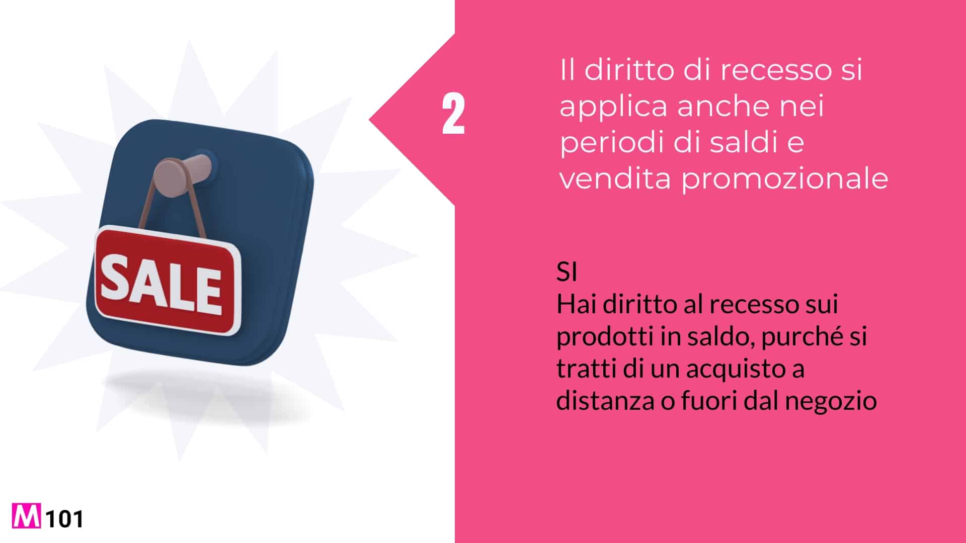 Nel Codice del Consumo, il diritto di recesso è un diritto che appartiene al consumatore che gli consente di rescindere un contratto di vendita per un periodo limitato di tempo, quindi di cambiare idea sul suo acquisto, senza dover fornire una motivazione e senza pagare penali.